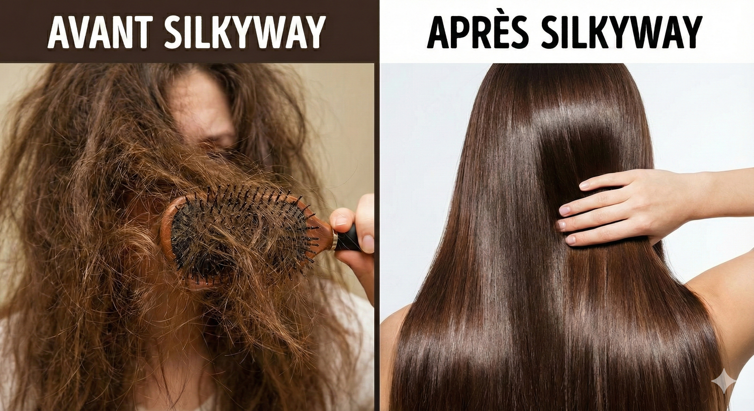 À gauche, le résultat d'une nuit sur du coton : la friction casse la fibre et crée des nœuds. À droite, le résultat SilkyWay : la soie préserve l'hydratation et lisse les cuticules pour une brillance immédiate.